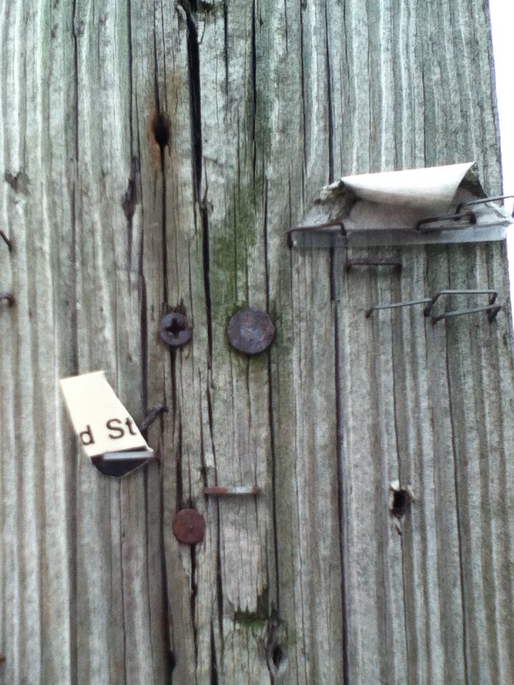SCOTT: We move closer to see the presence of older staples and nails that trace the presence of others who have come before us. They are the traces of rusted and splintered tactics: the nails and staples holding the remnants of posters, ads, and flyers stripped away, and left there by generations of people needing to take similar actions. A palimpsest whose ruin documents a narrative of collective others who need to work extra jobs, or need to support each other, or need to find that lost cat.